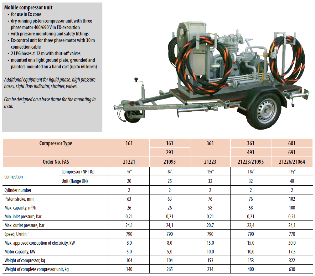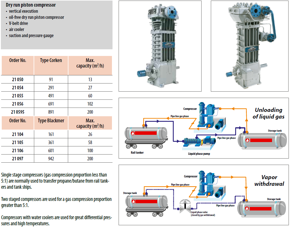Les compresseurs pour gaz de pétrole liquéfié (GPL) sont utilisés pour le transbordement des livraisons de produits, par ex. dans les parcs de stockage ainsi que sur les camions-citernes et pour l’extraction des réservoirs de stockage sur le site afin que les réservoirs puissent ensuite être ouverts ou transportés. Selon le modèle de compresseur, le débit varie entre 3,4 et 704 m3 par heure. La plage de travail est max. 31 bar.
